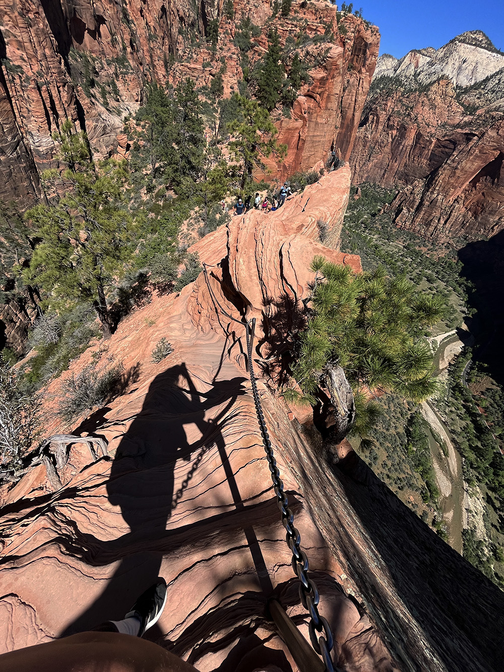 | Angels Landing -reittiä ei turhaan sanota hurjaksi. Osa reitistä edetään ketjun varassa rotkon reunalla. |